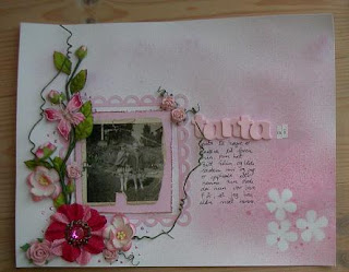 Og her er bidraget til skisseomania 52. Har brukt bazzill som er sprayet med glimmermist "marshmellow", snøfnugg fra riffraff som er malt med crackle paint "picket fence", glitrende hjerte fra melissa frances, bling fra prima E-line, thickers fra american craft og tiny alpha fra making memories. Bildet er fra forrige vinter, da storegull måtte legge seg ned i snøen for at mor skulle få tatt et skikkelig vinterbilde ;)